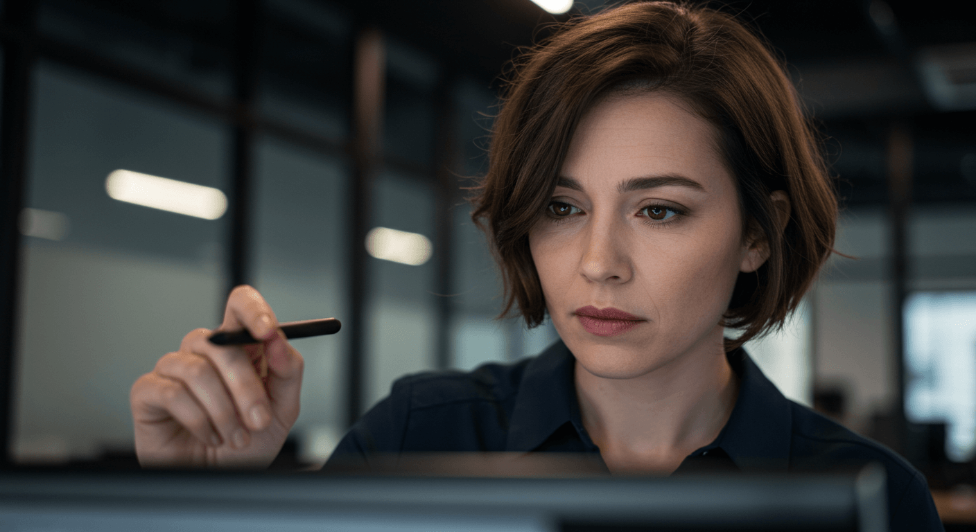 Showcasing a modern female professional immersed in her digital workflow, this high-resolution image reflects innovation and dedication in the workplace. The subject, holding a stylus and engaging with a large touchscreen display, symbolizes cutting-edge roles such as UX/UI design, digital content creation, fintech operations, and data analysis.