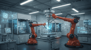 Step inside the laboratory of tomorrow, where industrial robots and intelligent machines collaborate seamlessly. These hyper-realistic images showcase advanced robotic arms manipulating scientific apparatus and high-tech machinery surrounded by holographic interfaces. The lab glows with digital overlays of molecular structures, process data, and networked analytics, evoking the convergence of Industry 4.0, artificial intelligence, and smart manufacturing. The visuals are crafted to inspire innovation and communicate a bold vision of automated production lines capable of self-optimization and precision control.