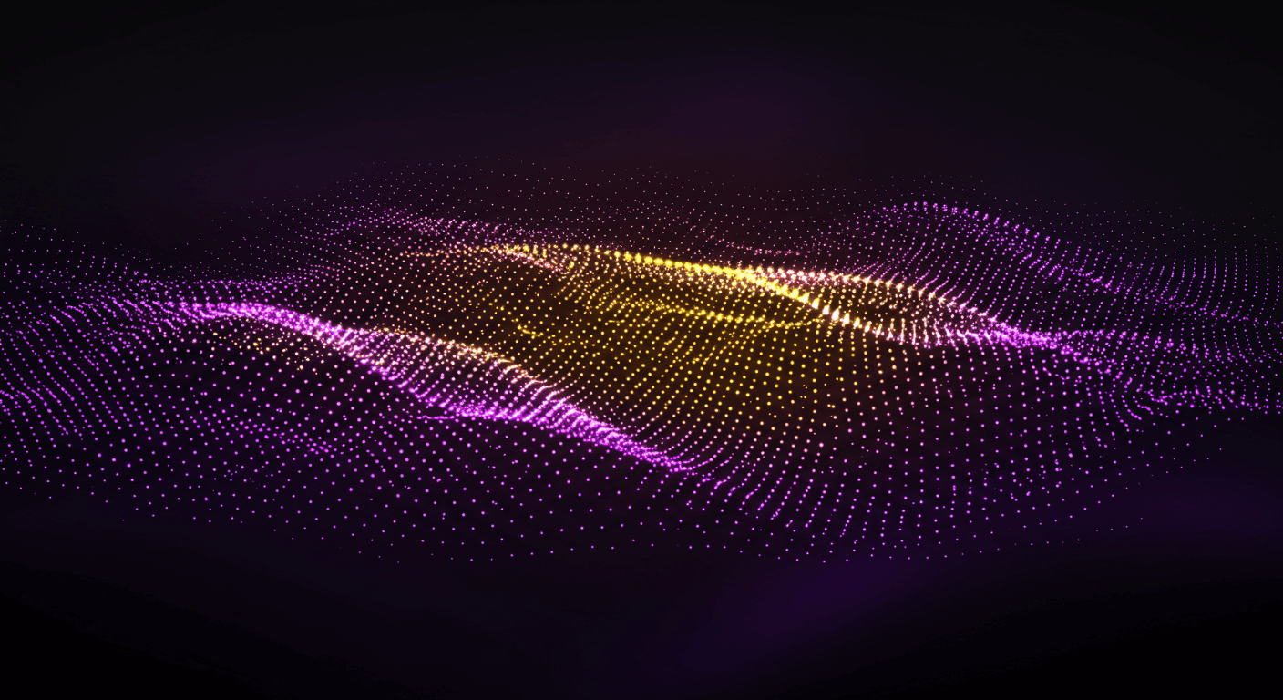 This futuristic digital background showcases flowing waves of glowing particles in vibrant purple and golden hues, set against a deep black canvas. The dynamic composition of light dots mimics data streams or galactic energy, making it perfect for technology presentations, music visuals, or any modern digital design. Its sense of motion and illumination delivers a cutting-edge and immersive atmosphere.