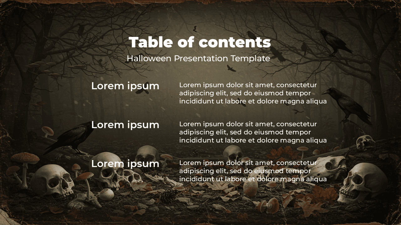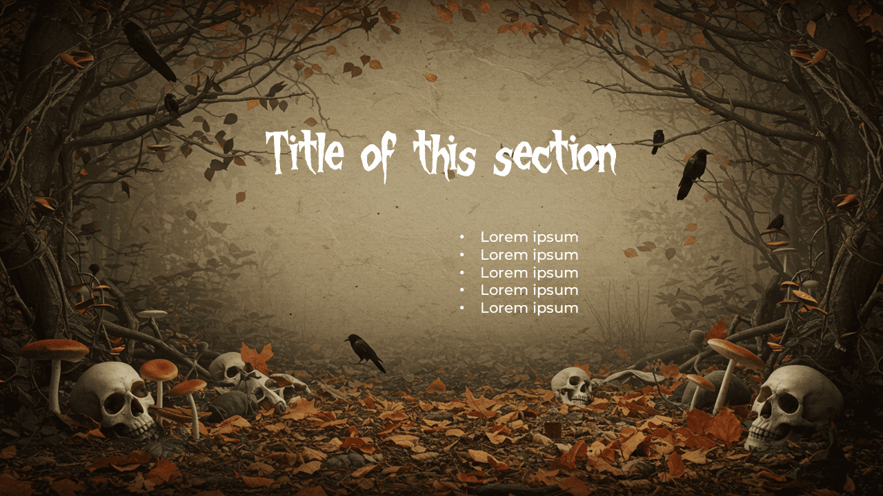 Make your story feel eerie and cinematic with this horror presentation template. Dark forest backdrops, fallen leaves, skulls, crows, and subtle grain textures create a tense, movie-poster atmosphere that pulls your audience in from the first slide. It’s perfect for mystery topics, spooky lessons, thriller pitches, or Halloween events. The deck is fully editable in PowerPoint and Google Slides, so you can swap images, tweak colors and type, and structure sections your way. Clean layouts keep everything readable while the visuals deliver the chills—ready to use and free to download.