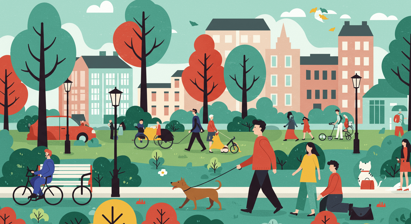 This charming flat illustration depicts a lively city park filled with people enjoying outdoor activities like walking dogs, cycling, and relaxing. The warm and colorful design captures the essence of community, nature, and leisure in an urban setting. Perfect for use in blogs, presentations, and marketing visuals that emphasize lifestyle, wellness, or city living.